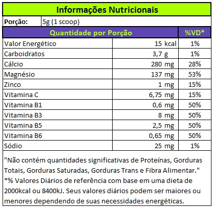 SABOR LIMÃO: (Taurina 1.600 mg / 400 ml), Glucoronolactona 1.000 mg / 400 ml, Cafeína 140 mg / 400 ml, Inositol 80 mg / 400 ml), FÓRMULA BETA PUMP (Semente de uva em pó (Vitis Vinífera), Bisglicinato de zinco, Bisglicinato de cálcio, Bisglicinato de magnésio, Polpa de melancia desidratada (Citrullus Vulgaris Extract)), mix de vitaminas [ B9 (ácido fólico), C (ácido ascórbico), B3 (nicotinamida), B5 (pantotenato de cálcio), B12 (cianocobalamina), B6(piridoxina), B1 (tiamina), B2 (riboflavina) ], Aromas Artificiais, Goma Xantana (espessante), Ácido Cítrico (acidulante), Corantes Artificial Verde Folha e Sucralose (edulcorante). “NÃO CONTÉM GLÚTEN”.